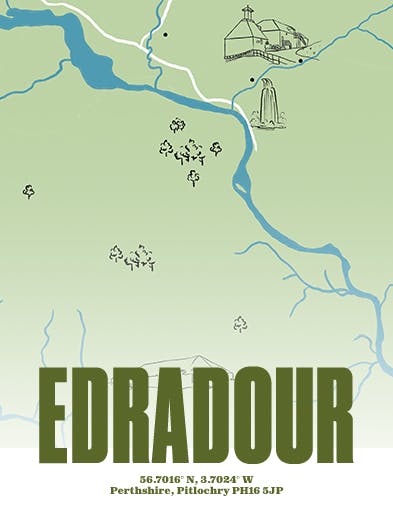 Située dans un village pittoresque du Speyside, la distillerie Edradour repose au creux d’une vallée traversée par un cours d’eau qui lui a donné son nom. Accessible par une route étroite bordée de murets de pierre, on la repère à sa pagode qui semble émerger des champs et pâturages. Le site, bordé de forêts, séduit par son charme simple : bâtiments blanchis à la chaux, huisseries rouges et parterres de fleurs éclatants.