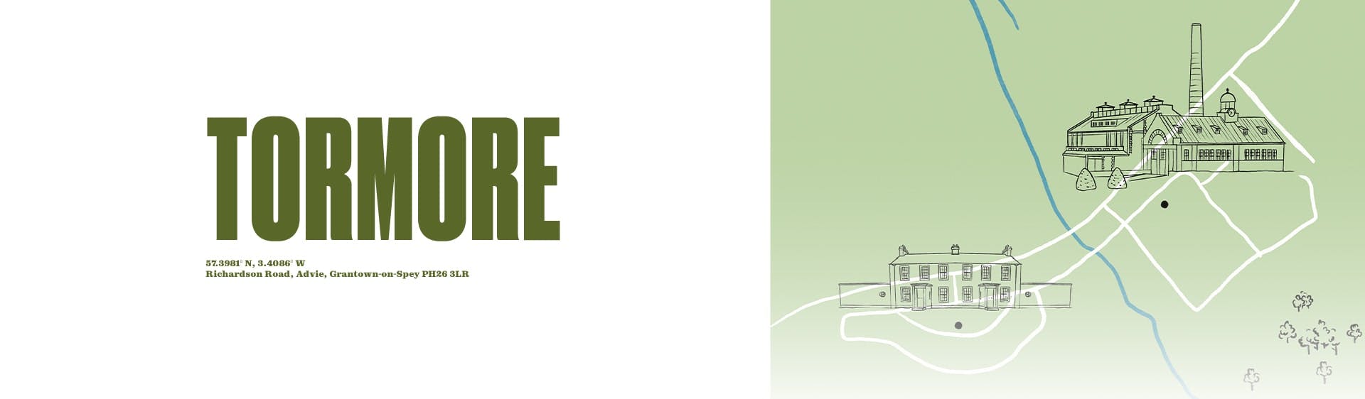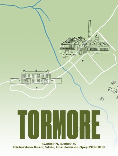 Bordée par une vaste forêt de conifères, la distillerie Tormore se dresse aux abords de la Spey, à la lisière du parc national des Cairngorms. Édifiée entre 1958 et 1960 par Alexander Cullen (1892-1963) et Sir Albert Richardson (1880-1964), son architecture contraste avec le style traditionnel des distilleries écossaises, avec ses toitures en cuivre patiné, ses façades en granit percées de fenêtres à petits carreaux et son imposante horloge musicale.